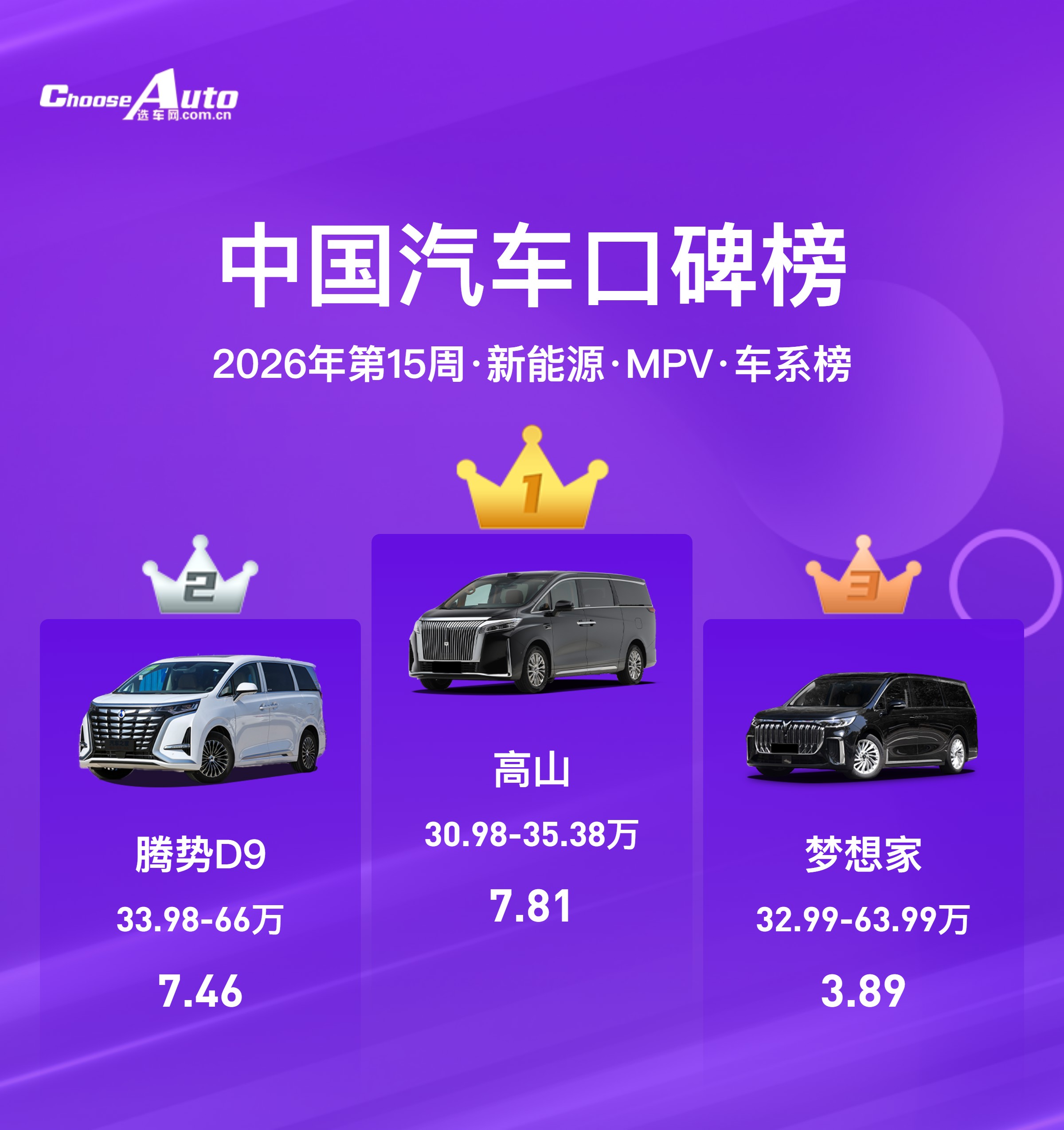 魏牌高山以7.81 分拿下周榜冠军,30.98-35.38 万的定价精准切入高端家用 MPV 市场,凭借豪华的内饰、舒适的乘坐体验,成为高端家庭用户的新选择。第二名腾势 D9(7.46 分)作为市场老将,33.98-66 万的价格覆盖了从家用到商务的全场景,依然是用户心中的标杆车型;第三名岚图梦想家(3.89 分)则以 32.99-63.99 万的定价,在高端市场持续发力,收获了追求品质的用户认可。