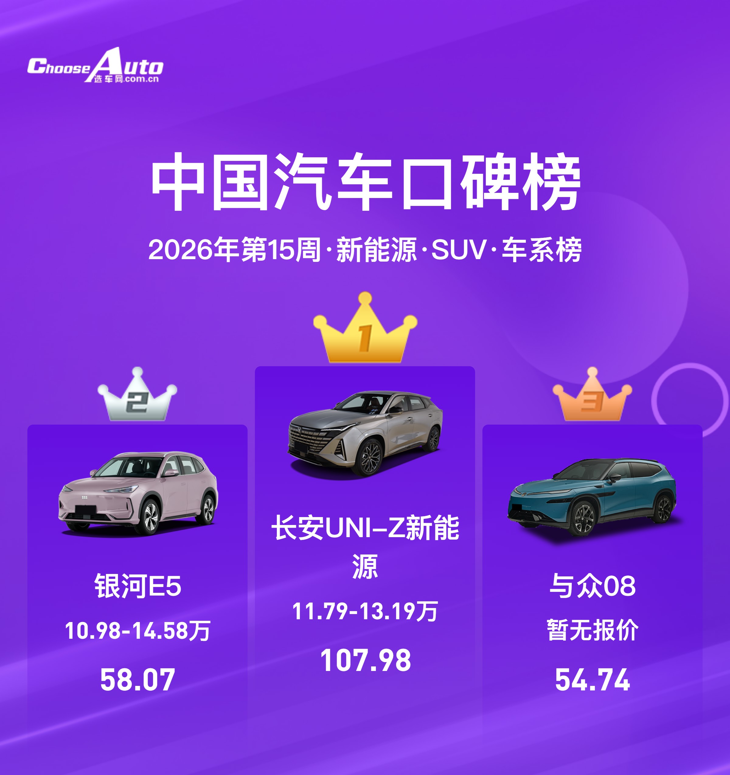 在竞争最激烈的新能源 SUV 赛道,长安 UNI-Z 新能源以107.98 分的绝对优势拿下周榜冠军,大幅领先第二名银河 E5(58.07 分)和第三名与众 08(54.74 分),成为本周最大黑马。